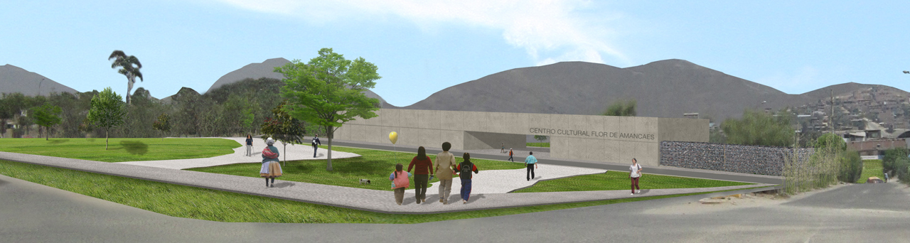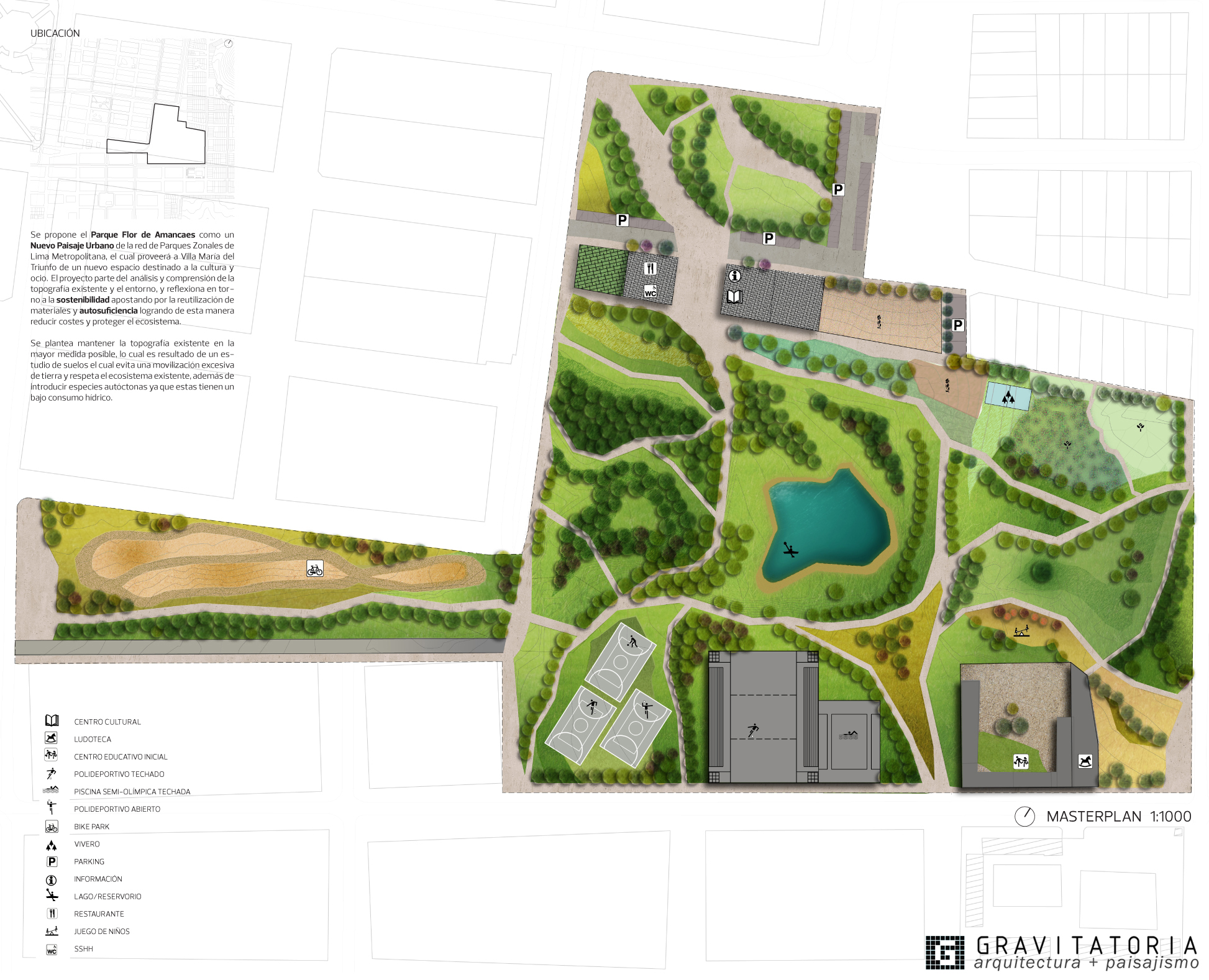 Se propone el Parque Flor de Amancaes como un Nuevo Paisaje Urbano de la red de Parques Zonales de Lima Metropolitana, el cual proveerá a Villa María del Triunfo de un nuevo espacio destinado a la cultura y ocio // El proyecto parte del análisis y comprensión de la topografía existente y el entorno, y reflexiona en torno a la sostenibilidad apostando por la reutilización de materiales y autosuficiencia logrando de esta manera reducir costes y proteger el ecosistema // Se plantea mantener la topografía existente en la mayor medida posible, lo cual es resultado de un estudio de suelos el cual evita una movilización excesiva de tierra y respeta el ecosistema existente, además de introducir especies autóctonas ya que estas tienen un bajo consumo hídrico // El Parque se proyecta como un espacio de paseo, estancia y juegos controlados; se plantea como un ecosistema natural artificializado para el uso de las personas y como una oportunidad para explorar las capacidades y los valores potenciales del lugar // Nuestra propuesta cuenta con un gran borde perimetral el cual actúa como espacio de mediación entre la urbanización edificada y el Parque, albergando una gran cantidad de equipamientos y actividades para el encuentro (terrazas, quioscos, parques infantiles y espacios para ancianos, polideportivos abierto y cerrado, piscina techada, etc) // Esta configuración supone la concentración de gran parte de la carga de uso, permitiendo aliviar los espacios interiores para que se pueda mantener un equilibrio adecuado de consumo de recursos y energía // El gran borde de cierre perimetral integra los principales programas y genera a su vez un ingreso principal del barrio hacia el parque a través del Centro Cultural // La estructura topográfica propuesta incorpora tanto las preocupaciones relativas a la conservación del suelo y del agua para fines de riego, como a la realización de infraestructuras y accesos // Así, enfatiza el dominio de la ruta principal y extrema la capacidad de acumulación de agua en el lago propuesto. Por otro lado, las formas secundadas del relieve se suavizan y geometrizan, de manera que se vuelvan reconocibles //El plan de accesibilidad viene determinado por la inserción del Parque en la trama morfológica y urbana, concretamente por el sistema vial de conexión el cual es resultado del estudio topográfico parametrizado el cual soluciona el recorrido mas eficiente posible sin realizar (casi) movimientos de tierra // El sistema de lago/reservorio introduce una dinámica radial, de manera que se genera un interesante sistema de circulación peatonal desfragmentando los usuales recorridos lineales en formas mas geométricas que responden a la huella/memoria existente y optimizan los recorridos a la vez de generar espacios abiertos.