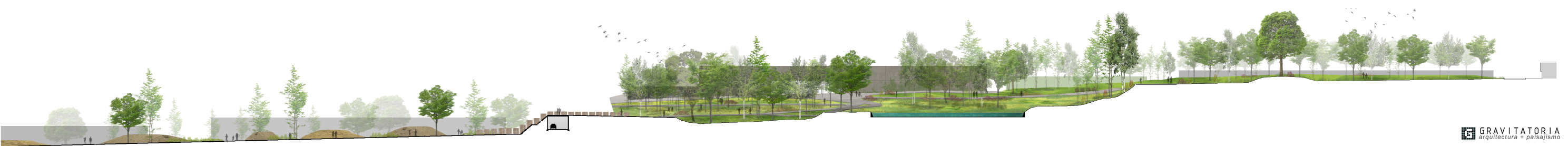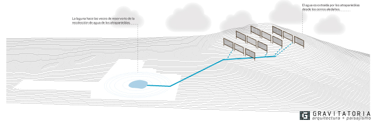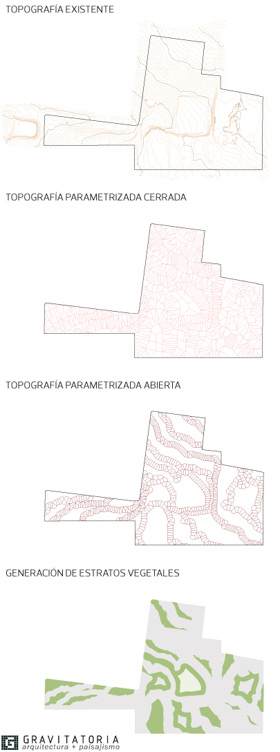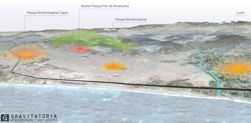 Se propone el Parque Flor de Amancaes como un Nuevo Paisaje Urbano de la red de Parques Zonales de Lima Metropolitana, el cual proveerá a Villa María del Triunfo de un nuevo espacio destinado a la cultura y ocio // El proyecto parte del análisis y comprensión de la topografía existente y el entorno, y reflexiona en torno a la sostenibilidad apostando por la reutilización de materiales y autosuficiencia logrando de esta manera reducir costes y proteger el ecosistema // Se plantea mantener la topografía existente en la mayor medida posible, lo cual es resultado de un estudio de suelos el cual evita una movilización excesiva de tierra y respeta el ecosistema existente, además de introducir especies autóctonas ya que estas tienen un bajo consumo hídrico // El Parque se proyecta como un espacio de paseo, estancia y juegos controlados; se plantea como un ecosistema natural artificializado para el uso de las personas y como una oportunidad para explorar las capacidades y los valores potenciales del lugar // Nuestra propuesta cuenta con un gran borde perimetral el cual actúa como espacio de mediación entre la urbanización edificada y el Parque, albergando una gran cantidad de equipamientos y actividades para el encuentro (terrazas, quioscos, parques infantiles y espacios para ancianos, polideportivos abierto y cerrado, piscina techada, etc) // Esta configuración supone la concentración de gran parte de la carga de uso, permitiendo aliviar los espacios interiores para que se pueda mantener un equilibrio adecuado de consumo de recursos y energía // El gran borde de cierre perimetral integra los principales programas y genera a su vez un ingreso principal del barrio hacia el parque a través del Centro Cultural // La estructura topográfica propuesta incorpora tanto las preocupaciones relativas a la conservación del suelo y del agua para fines de riego, como a la realización de infraestructuras y accesos // Así, enfatiza el dominio de la ruta principal y extrema la capacidad de acumulación de agua en el lago propuesto. Por otro lado, las formas secundadas del relieve se suavizan y geometrizan, de manera que se vuelvan reconocibles //El plan de accesibilidad viene determinado por la inserción del Parque en la trama morfológica y urbana, concretamente por el sistema vial de conexión el cual es resultado del estudio topográfico parametrizado el cual soluciona el recorrido mas eficiente posible sin realizar (casi) movimientos de tierra // El sistema de lago/reservorio introduce una dinámica radial, de manera que se genera un interesante sistema de circulación peatonal desfragmentando los usuales recorridos lineales en formas mas geométricas que responden a la huella/memoria existente y optimizan los recorridos a la vez de generar espacios abiertos.